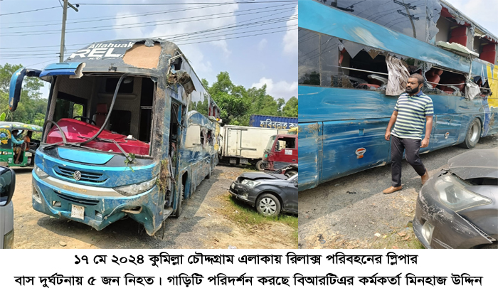 হাইওয়ে পুলিশ কুমিল্লা রিজিয়নের অতিরিক্ত ডিআইজি মো: খাইরুল আলম এর নির্দেশনা মোতাবেক মিয়াবাজার হাইওয়ে থানা পুলিশ সূত্রে জানা যায়, গত ১৭ মে রাত অনুমান ১২ টা ৪০ মিনিটে ঢাকার আরামবাগ হতে রিলাক্স পরিবহনের একটি স্লিপার বাস চট্রগ্রাম জেলার উদ্দেশ্যে রওনা করে। সকাল অনুমান ৬ ঘটিকায় কুমিল্লার কোটবাড়ি বিশ্বরোডে হোটেল শাহজাহানে রিলাক্স পরিবহন বাসটি ২০/২৫ মিনিটের যাত্রা বিরতির পর চট্টগ্রাম জেলার উদ্দেশ্যে পুনরায় রওনা করে এবং মিয়াবাজার হাইওয়ে থানাধীন চৌদ্দগ্রাম এর বসন্তপুর নামক স্থানে রিলাক্স পরিবহন যার রেজিষ্ট্রেশন নং যশোর-ব-১১-০২৫১ নিয়ন্ত্রণ হারিয়ে রাস্তার বাম পাশে বাঁশঝাড়ে নামিয়ে দিলে গাড়িটি বাম দিকে কাঁত হয়ে পড়ে এবং গাড়ির নিচে চাপা পড়ে গাড়িতে থাকা ১ জন সুপারভাইজার ১ জন হেলপার সহ সর্বমোট ৫ জন নিহত হয়।